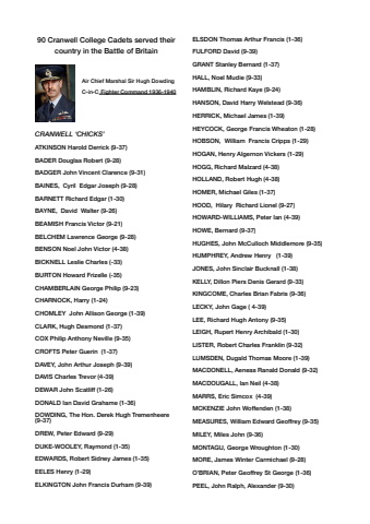 90 Cranwell College Cadets served their country in the Battle of BritainAir Chief Marshal Sir Hugh Dowding C-in-C Fighter Command 1936-1940 CRANWELL %u2018CHICKS%u2019 ATKINSON Harold Derrick (9-37)%u00a0%u00a0BADER Douglas Robert (9-28) BADGER John Vincent Clarence (9-31) BAINES,%u00a0%u00a0Cyril%u00a0%u00a0Edgar Joseph (9-28) BARNETT Richard Edgar (1-30) BAYNE,%u00a0%u00a0David%u00a0%u00a0Walter (9-26) BEAMISH Francis Victor (9-21) BELCHEM Lawrence George (9-28) BENSON Noel John Victor (4-38) BICKNELL Leslie Charles (-33) BURTON Howard Frizelle (-35) CHAMBERLAIN George Philip (9-23) CHARNOCK, Harry (1-24) CHOMLEY John Allison George (1-39) CLARK, Hugh Desmond (1-37) COX Philip Anthony Neville (9-35) CROFTS Peter Guerin (1-37) DAVEY, John Arthur Joseph (9-39) DAVIS Charles Trevor (4-39) DEWAR John Scatliff (1-26) DONALD Ian David Grahame (1-36)%u00a0%u00a0DOWDING, The Hon. Derek Hugh Tremenheere (9-37) DREW, Peter Edward (9-29) DUKE-WOOLEY, Raymond (1-35) EDWARDS, Robert Sidney James (1-35) EELES Henry (1-29) ELKINGTON John Francis Durham (9-39) ELSDON Thomas Arthur Francis (1-36) FULFORD David (9-39) GRANT Stanley Bernard (1-37) HALL, Noel Mudie (9-33) HAMBLIN, Richard Kaye (9-24) HANSON, David Harry Welstead (9-36) HERRICK, Michael James (1-39) HEYCOCK, George Francis Wheaton (1-28) HOBSON,%u00a0%u00a0William%u00a0%u00a0Francis Cripps (1-29) HOGAN, Henry Algernon Vickers (1-29) HOGG, Richard Malzard (4-38) HOLLAND, Robert Hugh (4-38) HOMER, Michael Giles (1-37) HOOD,%u00a0%u00a0Hilary%u00a0%u00a0Richard Lionel (9-27) HOWARD-WILLIAMS, Peter Ian (4-39) HOWE, Bernard (9-37) HUGHES, John McCulloch Middlemore (9-35) HUMPHREY, Andrew Henry%u00a0%u00a0 (1-39) JONES, John Sinclair Bucknall (1-38) KELLY, Dillon Piers Denis Gerard (9-33) KINGCOME, Charles Brian Fabris (9-36) LECKY, John Gage ( 4-39) LEE, Richard Hugh Antony (9-35) LEIGH, Rupert Henry Archibald (1-30) LISTER, Robert Charles Franklin (9-32) LUMSDEN, Dugald Thomas Moore (1-39) MACDONELL, Aeneas Ranald Donald (9-32) MACDOUGALL, Ian Neil (4-38) MARRS, Eric Simcox%u00a0%u00a0(4-39) MCKENZIE John Woffenden (1-38) MEASURES, William Edward Geoffrey (9-35) MILEY, Miles John (9-36) MONTAGU, George Wroughton (1-30) MORE, James Winter Carmichael (9-28) O%u2019BRIAN, Peter Geoffrey St George (1-36) PEEL, John Ralph, Alexander (9-30)