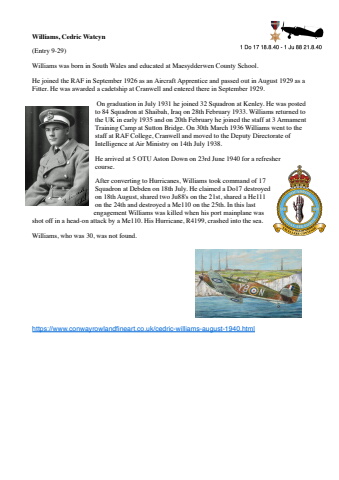 Williams, Cedric Watcyn(Entry 9-29) Williams was born in South Wales and educated at Maesydderwen County School.He joined the RAF in September 1926 as an Aircraft Apprentice and passed out in August 1929 as a Fitter. He was awarded a cadetship at Cranwell and entered there in September 1929. On graduation in July 1931 he joined 32 Squadron at Kenley. He was posted to 84 Squadron at Shaibah, Iraq on 28th February 1933. Williams returned to the UK in early 1935 and on 20th February he joined the staff at 3 Armament Training Camp at Sutton Bridge. On 30th March 1936 Williams went to the staff at RAF College, Cranwell and moved to the Deputy Directorate of Intelligence at Air Ministry on 14th July 1938.He arrived at 5 OTU Aston Down on 23rd June 1940 for a refresher course. After converting to Hurricanes, Williams took command of 17 Squadron at Debden on 18th July. He claimed a Do17 destroyed on 18th August, shared two Ju88's on the 21st, shared a He111 on the 24th and destroyed a Me110 on the 25th. In this last engagement Williams was killed when his port mainplane was shot off in a head-on attack by a Me110. His Hurricane, R4199, crashed into the sea.Williams, who was 30, was not found.https://www.conwayrowlandfineart.co.uk/cedric-williams-august-1940.html