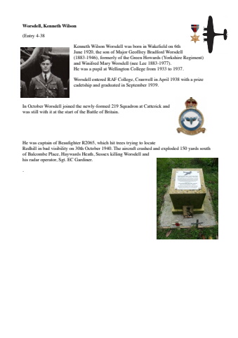 Worsdell, Kenneth Wilson (Entry 4-38Kenneth Wilson Worsdell was born in Wakefield on 6th June 1920, the son of Major Geoffrey Bradford Worsdell (1883-1946), formerly of the Green Howards (Yorkshire Regiment) and Winifred Mary Worsdell (nee Lee 1883-1977).He was a pupil at Wellington College from 1933 to 1937. Worsdell entered RAF College, Cranwell in April 1938 with a prize cadetship and graduated in September 1939.%u00a0%u00a0In October Worsdell joined the newly-formed 219 Squadron at Catterick and was still with it at the start of the Battle of Britain.He was captain of Beaufighter R2065, which hit trees trying to locate Redhill in bad visibility on 30th October 1940. The aircraft crashed and exploded 150 yards southof Balcombe Place, Haywards Heath, Sussex killing Worsdell and his radar operator, Sgt. EC Gardiner..