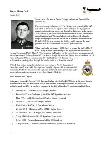 Sawyer, Henry Cecil(Entry 1-33)Sawyer was educated at Dover College and entered Cranwell in January 1933.Upon graduating in December 1934, Sawyer was posted to No. 142 Squadron at Andover. As a junior pilot, he honed his flying under operational conditions, mastering formation-flying and aerial tactics. Two years later, his technical acumen earned him a staff appointment at the Electrical and Wireless School back at Cranwell, where he taught emerging aviators the critical art of airborne communications. By July 1938, he was back on the College staff, shaping the next generation of RAF officers on the eve of global conflict.When war broke out in early 1940, Sawyer joined the staff of No. 9 Base Group Station, contributing to the organisational backbone of Fighter Command. On 27 May 1940, he swapped staff duties for the cockpit once more, arriving at No. 6 Operational Training Unit (OTU) at Sutton Bridge for refresher flying. Just weeks later, on 15June, he became Officer Commanding %u2018B%u2019 Flight at the newly formed No. 7 OTU in Hawarden, guiding pilots through the vital transition to front-line aircraft.With Britain%u2019s skies under threat, Sawyer was posted to No. 65 Squadron at Hornchurch on 2 July 1940. Six days later, at only 25 years old, he assumed full command. Under his leadership, the squadron undertook dawn patrols and night interceptions during the darkest hours of the Battle of Britain. Final Mission and LegacyIn the early hours of 2 August 1940, Sawyer climbed into Spitfire R6799 for a night patrol launch. Moments after take-off, the aircraft stalled and crashed, bursting into flames. He was killed instantly, aged just 25. He was later cremated at the City of London Crematorium in East Ham.%u2022 January 1933 %u2013 Entered RAF College, Cranwell%u2022 December 1934 %u2013 Graduated; joined No. 142 Squadron, Andover%u2022 May 1936 %u2013 Staff, Electrical and Wireless School, Cranwell%u2022 July 1938 %u2013 Staff, RAF College, Cranwell%u2022 Early 1940 %u2013 Staff, No. 9 Base Group Station%u2022 27 May 1940 %u2013 Refresher at No. 6 OTU, Sutton Bridge%u2022 15 June 1940 %u2013 OC %u2018B%u2019 Flight, No. 7 OTU, Hawarden%u2022 2 July 1940 %u2013 Posted to No. 65 Squadron, Hornchurch%u2022 8 July 1940 %u2013 Assumed command of No. 65 Squadron%u2022 2 August 1940 %u2013 Killed in Spitfire R6799 crash; cremated at East Ham.