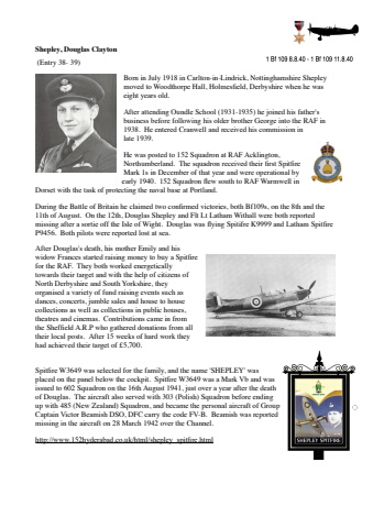 Shepley, Douglas Clayton (Entry 38- 39)Born in July 1918 in Carlton-in-Lindrick, Nottinghamshire Shepley moved to Woodthorpe Hall, Holmesfield, Derbyshire when he was eight years old.%u00a0%u00a0After attending Oundle School (1931-1935) he joined his father's business before following his older brother George into the RAF in 1938.%u00a0%u00a0He entered Cranwell and received his commission in late 1939.%u00a0%u00a0He was posted to 152 Squadron at RAF Acklington, Northumberland.%u00a0%u00a0The squadron received their first Spitfire Mark 1s in December of that year and were operational by early 1940.%u00a0%u00a0152 Squadron flew south to RAF Warmwell in Dorset with the task of protecting the naval base at Portland.%u00a0%u00a0During the Battle of Britain he claimed two confirmed victories, both Bf109s, on the 8th and the 11th of August.%u00a0%u00a0On the 12th, Douglas Shepley and Flt Lt Latham Withall were both reported missing after a sortie off the Isle of Wight.%u00a0%u00a0Douglas was flying Spitifre K9999 and Latham Spitfire P9456.%u00a0%u00a0Both pilots were reported lost at sea.After Douglas's death, his mother Emily and his widow Frances started raising money to buy a Spitfire for the RAF.%u00a0%u00a0They both worked energetically towards their target and with the help of citizens of North Derbyshire and South Yorkshire, they organised a variety of fund raising events such as dances, concerts, jumble sales and house to house collections as well as collections in public houses, theatres and cinemas.%u00a0%u00a0Contributions came in from the Sheffield A.R.P who gathered donations from all their local posts.%u00a0%u00a0After 15 weeks of hard work they had achieved their target of %u00a35,700.Spitfire W3649 was selected for the family, and the name 'SHEPLEY' was placed on the panel below the cockpit.%u00a0%u00a0Spitfire W3649 was a Mark Vb and was issued to 602 Squadron on the 16th August 1941, just over a year after the death of Douglas.%u00a0%u00a0The aircraft also served with 303 (Polish) Squadron before ending up with 485 (New Zealand) Squadron, and became the personal aircraft of Group Captain Victor Beamish DSO, DFC carry the code FV-B.%u00a0%u00a0Beamish was reported missing in the aircraft on 28 March 1942 over the Channel.http://www.152hyderabad.co.uk/html/shepley_spitfire.html