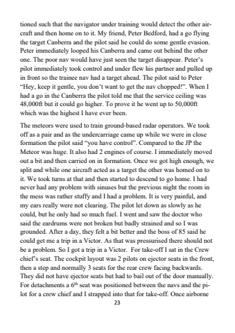 23tioned such that the navigator under training would detect the other aircraft and then home on to it. My friend, Peter Bedford, had a go flying the target Canberra and the pilot said he could do some gentle evasion. Peter immediately looped his Canberra and came out behind the other one. The poor nav would have just seen the target disappear. Peter%u2019s pilot immediately took control and under flew his partner and pulled up in front so the trainee nav had a target ahead. The pilot said to Peter%u201cHey, keep it gentle, you don%u2019t want to get the nav chopped!%u201d. When I had a go in the Canberra the pilot told me that the service ceiling was 48,000ft but it could go higher. To prove it he went up to 50,000ft which was the highest I have ever been. The meteors were used to train ground-based radar operators. We took off as a pair and as the undercarriage came up while we were in close formation the pilot said %u201cyou have control%u201d. Compared to the JP the Meteor was huge. It also had 2 engines of course. I immediately moved out a bit and then carried on in formation. Once we got high enough, we split and while one aircraft acted as a target the other was homed on to it. We took turns at that and then started to descend to go home. I had never had any problem with sinuses but the previous night the room in the mess was rather stuffy and I had a problem. It is very painful, and my ears really were not clearing. The pilot let down as slowly as he could, but he only had so much fuel. I went and saw the doctor who said the eardrums were not broken but badly strained and so I was grounded. After a day, they felt a bit better and the boss of 85 said he could get me a trip in a Victor. As that was pressurised there should not be a problem. So I got a trip in a Victor. For take-off I sat in the Crew chief%u2019s seat. The cockpit layout was 2 pilots on ejector seats in the front, then a step and normally 3 seats for the rear crew facing backwards. They did not have ejector seats but had to bail out of the door manually. For detachments a 6th seat was positioned between the navs and the pilot for a crew chief and I strapped into that for take-off. Once airborne