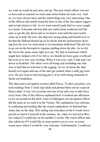 26we went on watch he put more sail up. The next watch officer was notso keen and so insisted we took some down before he took over. And so, we were always busy and the whole thing was very interesting. One of the officers had sailed round the horn in one of the last square riggers and so had stories to tell. As we went round Lands End we were caught in a storm. It became obvious that our watch alone could not reef the sails or get the jibs down and so we had to wait until the next watch came up to help. By now, the ship was racing along and heeled over so far that the lifeboat floated up on its davits and the inclinometer showing how far over we went stuck at its maximum deflection! My job was to go out on the bowsprit to organise pulling down the jibs. As we hit the waves the spray came right over me. We had on harnesses which might have helped a bit if we fell so we should not have gone overboard but even so it was very exciting. When it was over, only 2 lads and I sat down to breakfast. The others were all being sick including one who was so bad that we tied him to the rigging. As we sat down the ship heeled over again and one of the lads got soaked when a milk jug went over. He just went to bed leaving just 2 of us with strong stomachs to finish our breakfasts. The ship used a navigation system called Decca. To plot a position, you took readings from 3 clock type dials and plotted them out on a special Decca chart. It was very accurate and one of my jobs was to take fixes every hour. One of the officers explained how it worked one afternoon as we sat around on the deck. Later at Oakington our navigation officer did the same as we used it in the Varsity. His explanation was extremely confusing and nothing like the casual explanation we had had that sunny day on the ship. This sailing trip took place in the 6 weeks leave period we had at Cranwell in the summer. So, when we arrived at Bristol I asked if I could stay on for another 2 weeks. My watch officer had also asked me if I would like at some point to act as crew on some ocean races where I would be very welcome. Unfortunately, I could not