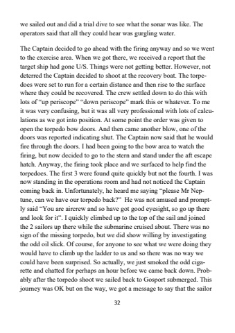 32we sailed out and did a trial dive to see what the sonar was like. The operators said that all they could hear was gurgling water.The Captain decided to go ahead with the firing anyway and so we went to the exercise area. When we got there, we received a report that the target ship had gone U/S. Things were not getting better. However, not deterred the Captain decided to shoot at the recovery boat. The torpedoes were set to run for a certain distance and then rise to the surface where they could be recovered. The crew settled down to do this with lots of %u201cup periscope%u201d %u201cdown periscope%u201d mark this or whatever. To me it was very confusing, but it was all very professional with lots of calculations as we got into position. At some point the order was given to open the torpedo bow doors. And then came another blow, one of the doors was reported indicating shut. The Captain now said that he would fire through the doors. I had been going to the bow area to watch the firing, but now decided to go to the stern and stand under the aft escape hatch. Anyway, the firing took place and we surfaced to help find the torpedoes. The first 3 were found quite quickly but not the fourth. I was now standing in the operations room and had not noticed the Captain coming back in. Unfortunately, he heard me saying %u201cplease Mr Neptune, can we have our torpedo back?%u201d He was not amused and promptly said %u201cYou are aircrew and so have got good eyesight, so go up there and look for it%u201d. I quickly climbed up to the top of the sail and joined the 2 sailors up there while the submarine cruised about. There was no sign of the missing torpedo, but we did show willing by investigating the odd oil slick. Of course, for anyone to see what we were doing they would have to climb up the ladder to us and so there was no way we could have been surprised. So actually, we just smoked the odd cigarette and chatted for perhaps an hour before we came back down. Probably after the torpedo shoot we sailed back to Gosport submerged. This journey was OK but on the way, we got a message to say that the sailor