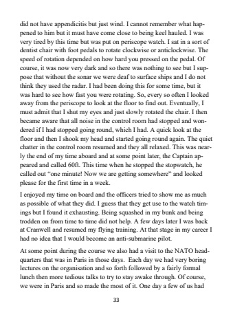 33did not have appendicitis but just wind. I cannot remember what happened to him but it must have come close to being keel hauled. I was very tired by this time but was put on periscope watch. I sat in a sort of dentist chair with foot pedals to rotate clockwise or anticlockwise. The speed of rotation depended on how hard you pressed on the pedal. Of course, it was now very dark and so there was nothing to see but I suppose that without the sonar we were deaf to surface ships and I do not think they used the radar. I had been doing this for some time, but it was hard to see how fast you were rotating. So, every so often I looked away from the periscope to look at the floor to find out. Eventually, I must admit that I shut my eyes and just slowly rotated the chair. I then became aware that all noise in the control room had stopped and wondered if I had stopped going round, which I had. A quick look at the floor and then I shook my head and started going round again. The quiet chatter in the control room resumed and they all relaxed. This was nearly the end of my time aboard and at some point later, the Captain appeared and called 60ft. This time when he stopped the stopwatch, he called out %u201cone minute! Now we are getting somewhere%u201d and looked please for the first time in a week.I enjoyed my time on board and the officers tried to show me as much as possible of what they did. I guess that they get use to the watch timings but I found it exhausting. Being squashed in my bunk and being trodden on from time to time did not help. A few days later I was back at Cranwell and resumed my flying training. At that stage in my career I had no idea that I would become an anti-submarine pilot. At some point during the course we also had a visit to the NATO headquarters that was in Paris in those days. Each day we had very boring lectures on the organisation and so forth followed by a fairly formal lunch then more tedious talks to try to stay awake through. Of course,we were in Paris and so made the most of it. One day a few of us had