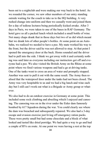 34been out to a nightclub and were making our way back to the hotel. As we rounded the corner, we saw other members of our entry standing outside waiting for the coach to take us to the HQ building. A very rushed change into uniform and then we casually went and joined themfor a day of tedious lectures being periodically kicked awake. After 3 days in Paris, we were taken to one of the bases in RAF Germany. The hotel gave us all a packed lunch which included a small bottle of wine. Not many chaps drank that in those days but two of us did which meant that we drank lots of other people%u2019s bottles. At some point on an Autobahn, we realised we needed to have a pee. My mate worked his way to the front, but the driver said he was not allowed to stop. At that point I opened the emergency door at the back. Horns sounded and the driver had to pull into the side. I think we got away with it and certainly nothing was said later as everyone including our instructors got off and everyone had a pee. We also visited the British Army on the Rhine at some point where we fired various weapons and had a go at driving tanks. One of the tanks went to cross an area of water and promptly stopped. Another was sent to pull it out with the same result. The Army then realised that the waterproof door under the tanks had not been closed. The Army was very hospitable to us and we had a big lunch and wine each day but I still can%u2019t work out what is a Brigade or Army group or whatever.We also had to do an outdoor exercise in Germany at some point. This included some rock climbing and abseiling which I enjoyed and canoeing. The canoeing was on in the river under the Eider dam famously bombed by 617 Squadron during the war. You could clearly see where the dam was breached and subsequently repaired. We also had a 3-dayescape and evasion exercise just living off emergency ration packs. These were pretty small but had some chocolate and a block of what looked and tasted like dried porridge. We had quite a way to go and had a couple of RVs en route. At one point we were having a rest at the top