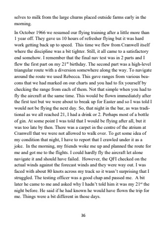 36selves to milk from the large churns placed outside farms early in the morning.In October 1966 we resumed our flying training after a little more than 1 year off. They gave us 10 hours of refresher flying but it was hard work getting back up to speed. This time we flew from Cranwell itself where the discipline was a bit tighter. Still, it all came to a satisfactory end somehow. I remember that the final nav test was in 2 parts and I flew the first part on my 21st birthday. The second part was a high-leveltriangular route with a diversion somewhere along the way. To navigate around the route we used Rebecca. This gave ranges from various beacons that we had marked on our charts and you had to fix yourself by checking the range from each of them. Not that simple when you had to fly the aircraft at the same time. This would be flown immediately after the first test but we were about to break up for Easter and so I was told I would not be flying the next day. So, that night in the bar, as was traditional as we all reached 21, I had a drink or 2. Perhaps most of a bottle of gin. At some point I was told that I would be flying after all, but it was too late by then. There was a carpet in the centre of the atrium at Cranwell that we were not allowed to walk over. To get some idea of my condition that night, I have to report that I crawled under it as a joke. In the morning, my friends woke me up and planned the route for me and got me to the flights. I could hardly fly the aircraft let alone navigate it and should have failed. However, the QFI checked on the actual winds against the forecast winds and they were way out. I was faced with about 80 knots across my track so it wasn%u2019t surprising that I struggled. The testing officer was a good chap and passed me. A bit later he came to me and asked why I hadn%u2019t told him it was my 21st the night before. He said if he had known he would have flown the trip for me. Things were a bit different in those days.