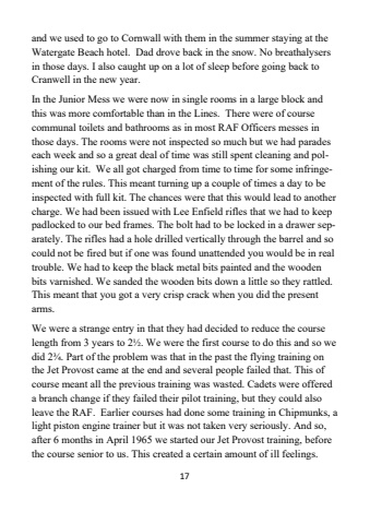 17and we used to go to Cornwall with them in the summer staying at the Watergate Beach hotel. Dad drove back in the snow. No breathalysers in those days. I also caught up on a lot of sleep before going back to Cranwell in the new year. In the Junior Mess we were now in single rooms in a large block and this was more comfortable than in the Lines. There were of course communal toilets and bathrooms as in most RAF Officers messes in those days. The rooms were not inspected so much but we had parades each week and so a great deal of time was still spent cleaning and polishing our kit. We all got charged from time to time for some infringement of the rules. This meant turning up a couple of times a day to be inspected with full kit. The chances were that this would lead to another charge. We had been issued with Lee Enfield rifles that we had to keep padlocked to our bed frames. The bolt had to be locked in a drawer separately. The rifles had a hole drilled vertically through the barrel and so could not be fired but if one was found unattended you would be in real trouble. We had to keep the black metal bits painted and the wooden bits varnished. We sanded the wooden bits down a little so they rattled. This meant that you got a very crisp crack when you did the present arms.We were a strange entry in that they had decided to reduce the course length from 3 years to 2%u00bd. We were the first course to do this and so we did 2%u00be. Part of the problem was that in the past the flying training on the Jet Provost came at the end and several people failed that. This of course meant all the previous training was wasted. Cadets were offered a branch change if they failed their pilot training, but they could also leave the RAF. Earlier courses had done some training in Chipmunks, a light piston engine trainer but it was not taken very seriously. And so,after 6 months in April 1965 we started our Jet Provost training, beforethe course senior to us. This created a certain amount of ill feelings.