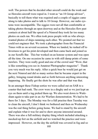 102well. The powers that be decided other aircraft could do the work and so Hercules aircraft were roped in. I went as %u201can 18 Group advisor%u201d, basically to tell them what was required and a couple of siggies came along to take photos and to talk to 18 Group. However, our radio systems were incompatible. The siggies were not all that comfortable at taking photos through an open doorway and as the Hercules flew past contacts at about half the speed of a Nimrod they took far too many photos on each run. We often took press people with us who always wanted photos of ships ramming each other. We pointed out that we could not engineer that. We took a photographer from the Financial Times with us on several occasions. When we landed, he rushed off to Inverness to get his print developed and then came back and joined us in our Scruffs Bar. This bar worked on an honour system and was open all the time. On one occasion he came in with still damp prints of some trawlers. They were really good and one of the crowd said %u201cWow, that is like something you see in Amateur Photographer magazine%u201d. Thank you very much was his reply. After a quick beer he would just get on the next Nimrod and did so many sorties that he became expert in the galley, bringing round drinks and so forth between anything interesting happening. He finally got the shots he was after and that was that.In an amongst these Fishop sorties we were called out on SAR to a coaster that had sunk. The crew were in a dinghy and so we just kept an eye on them until a tug picked them up. We also went down to Wattisham again to take part in an Air Warfare demonstration. We had to be there for 3 days. The Monday was for a full practise then Tuesday was to clean the aircraft, I don%u2019t think we bothered and then on Wednesday was the real thing before going home. We had to stand by the aircraft and explain what it was for and to show anyone interested around. There was also a full military display thing which included attacking a mocked-up fort on the airfield and we watched the practice and were impressed. However, on the day the airfield was covered in fog and so