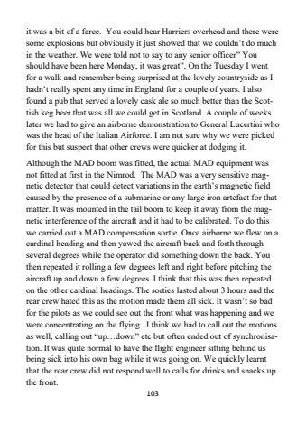 103it was a bit of a farce. You could hear Harriers overhead and there were some explosions but obviously it just showed that we couldn%u2019t do much in the weather. We were told not to say to any senior officer%u201d You should have been here Monday, it was great%u201d. On the Tuesday I went for a walk and remember being surprised at the lovely countryside as I hadn%u2019t really spent any time in England for a couple of years. I also found a pub that served a lovely cask ale so much better than the Scottish keg beer that was all we could get in Scotland. A couple of weeks later we had to give an airborne demonstration to General Lucertini who was the head of the Italian Airforce. I am not sure why we were picked for this but suspect that other crews were quicker at dodging it.Although the MAD boom was fitted, the actual MAD equipment was not fitted at first in the Nimrod. The MAD was a very sensitive magnetic detector that could detect variations in the earth%u2019s magnetic field caused by the presence of a submarine or any large iron artefact for thatmatter. It was mounted in the tail boom to keep it away from the magnetic interference of the aircraft and it had to be calibrated. To do this we carried out a MAD compensation sortie. Once airborne we flew on a cardinal heading and then yawed the aircraft back and forth through several degrees while the operator did something down the back. You then repeated it rolling a few degrees left and right before pitching the aircraft up and down a few degrees. I think that this was then repeated on the other cardinal headings. The sorties lasted about 3 hours and the rear crew hated this as the motion made them all sick. It wasn%u2019t so bad for the pilots as we could see out the front what was happening and we were concentrating on the flying. I think we had to call out the motions as well, calling out %u201cup%u2026down%u201d etc but often ended out of synchronisation. It was quite normal to have the flight engineer sitting behind us being sick into his own bag while it was going on. We quickly learnt that the rear crew did not respond well to calls for drinks and snacks up the front.
