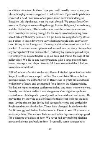 10in a little cotton tent. In those days you could usually camp where you like although you were supposed to ask a farmer if you could pitch in a corner of a field. You were often given some milk whilst doing so. Based on this trip the next year we went abroad. We got as far as Germany in 10 days or so traveling through France, Belgium, Luxembourg,and the Netherlands. The weather was poor the whole time and we were probably not eating enough for the work involved moving three speed bikes with heavy panniers. To get home we caught a ferry at Calais. Ferries in those days were very small and would only carry a few cars. Sitting in the lounge out of money and tired we must have looked wacked. A steward came up to us and we told him our story. Remember any foreign travel was unusual then, certainly by unaccompanied boys. He took pity on us and told us to go on deck and wait at the side of the galley door. We did so and were presented with a large plate of eggs, bacon, sausages, and chips. Wonderful. I was so excited that I had an immediate nosebleed. Bill left school after that so the next Easter I hitched up to Scotland with Roger Lovell and we camped on Ben Nevis and later Glencoe before hitching home. We got to the top of Ben Nevis in white out conditions with plenty of snow and got trapped for a time on the Glencoe ridge. We had no ropes or proper equipment and no one knew where we were. Frankly, we did not realise it was dangerous. One night in a pub we chatted to an old chap who proudly told us he could read and write. He proved this by showing us a certificate to that effect from his old regiment saying that on that day he had successfully read and copied the Regimental orders for the day. Times have changed. In the lower 6thPat Brownrigg and I often hitched over to Exeter to see Jill who was at university there. The various lads we met in her digs were always good for a cigarette or a glass of beer. We never had any problem hitching about and always got back in time. Eventually some younger boys