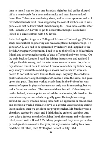12time to time. I was on duty one Saturday night but had earlier skipped off to a nearby pub for a beer and a smoke and must have stunk of them. Don Culver was wandering about, and he came up to me and so I moved backwards until I was stopped by the row of washbasins. It was quite clear that he knew what I had been up to. I was more careful after that. I needed 2 A Levels to get to Cranwell although I could have joined as a direct entrant with 6 O levels. I also had applied to go to a College of Advanced Technology (CAT) to study aeronautical engineering and was accepted at Loughborough. To go to a CAT, you had to be sponsored by industry and I applied to the British Aerospace Corporation. I had to go to their office in Wadebridge I think and so arranged a couple of days off school and went home. On the train back to London I read the joining instructions and realised I had got the date wrong, and the interviews were now over. So, after a day at home I went back to school. I cannot remember my father being very annoyed about this and it again shows how much we were expected to sort out our own lives in those days. Anyway, the academic qualifications for Loughborough and Cranwell were the same, so I gave up on that path. I had not worked overly hard in the 6th form but was assured of a pass in physics because not only was it interesting, but we had a first-class teacher. The same could not be said of chemistry and maths. Indeed, at some point we asked the headmaster, Mr Stredder, for extra chemistry tuition which he gladly gave. He taught us sitting around his lovely wooden dining table with no apparatus or blackboard,one evening a week, I think. He gave us a greater understanding during those sessions than we got from our proper teacher. Mr Stredder was a chemistry teacher by trade, and I think that he enjoyed teaching. Anyway, after a furious month of revising I took the exams and with some relief passed with a B and 2 Cs. Many people said they were particularly hard questions in maths that year, but my revision had by luck covered them all. Thus, I left Wellington School in July 1964.