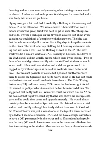 192Leeming and as it was now early evening other training stations would be closed. And so we had to drop into Waddington for more fuel and it was fairly late when we got home.Flying now got a bit muddled. I could fly a Bulldog in the morning and then a JP in the afternoon. We were allowed 3 hours SCT on each a month which was great, but it was hard to get in with other things we had to do. I wrote a tech quiz on the JP which covered just about every question we could think of complete with the answers. The idea was that the schools could pull it out on black flag days to keep the students on their toes. The week after my Bulldog A2 I flew my instrument rating and was now a CIRE on the Bulldog as well as the JP. The next week we did a week%u2019s visit to a UAS. Possibly at Cosford. We drove to the UASs and I did not usually record which ones I was testing. Two or three of us would go down and fly with the staff and students as much as we could. I flew with one student and it did not go too well. He begged to fly with me again as he said he could do much better next time. That was not possible of course but I pointed out that we were there to assess the Squadron and not to worry about it. He had just made one bad mistake and would no doubt learn from it. The Chief Flying Instructor (CFI) had been on my CFS course but had never got his A2. He wanted to go Specialist Aircrew but he had been turned down. We suggested that he fly with us. While we could not award him an A2 on the basis of that flight we could say that he was above his average category and he could then come and upgrade properly. He would almost certainly then be accepted as Spec Aircrew. He claimed to have a cold and so could not fly although he clearly did not have one. At Cosford the Control Tower was just a visual room at the top of a tower accessed by a ladder I seem to remember. UASs did not have enough instructors to have a QFI permanently in the tower and so if a student had a problem the duty QFI would have to run over to the tower and climb up before transmitting to the student. Most sorties we flew with students end-