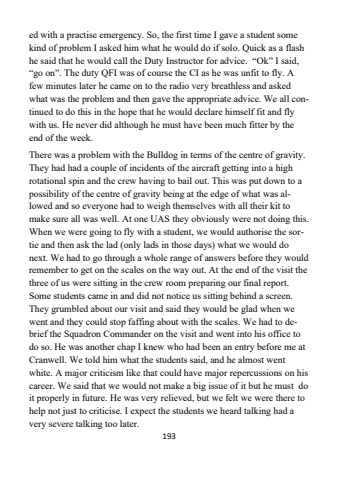 193ed with a practise emergency. So, the first time I gave a student some kind of problem I asked him what he would do if solo. Quick as a flash he said that he would call the Duty Instructor for advice. %u201cOk%u201d I said,%u201cgo on%u201d. The duty QFI was of course the CI as he was unfit to fly. A few minutes later he came on to the radio very breathless and asked what was the problem and then gave the appropriate advice. We all continued to do this in the hope that he would declare himself fit and fly with us. He never did although he must have been much fitter by the end of the week.There was a problem with the Bulldog in terms of the centre of gravity. They had had a couple of incidents of the aircraft getting into a high rotational spin and the crew having to bail out. This was put down to a possibility of the centre of gravity being at the edge of what was allowed and so everyone had to weigh themselves with all their kit to make sure all was well. At one UAS they obviously were not doing this. When we were going to fly with a student, we would authorise the sortie and then ask the lad (only lads in those days) what we would do next. We had to go through a whole range of answers before they would remember to get on the scales on the way out. At the end of the visit the three of us were sitting in the crew room preparing our final report. Some students came in and did not notice us sitting behind a screen. They grumbled about our visit and said they would be glad when we went and they could stop faffing about with the scales. We had to debrief the Squadron Commander on the visit and went into his office to do so. He was another chap I knew who had been an entry before me at Cranwell. We told him what the students said, and he almost went white. A major criticism like that could have major repercussions on his career. We said that we would not make a big issue of it but he must do it properly in future. He was very relieved, but we felt we were there to help not just to criticise. I expect the students we heard talking had a very severe talking too later.