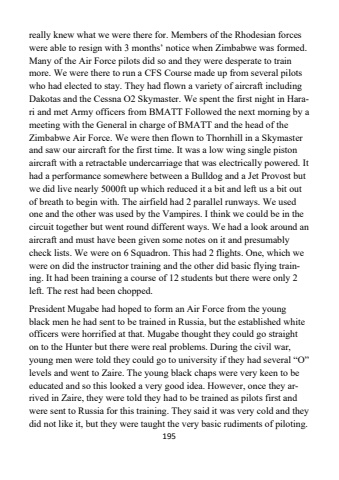 195really knew what we were there for. Members of the Rhodesian forces were able to resign with 3 months%u2019 notice when Zimbabwe was formed. Many of the Air Force pilots did so and they were desperate to train more. We were there to run a CFS Course made up from several pilots who had elected to stay. They had flown a variety of aircraft including Dakotas and the Cessna O2 Skymaster. We spent the first night in Harari and met Army officers from BMATT Followed the next morning by a meeting with the General in charge of BMATT and the head of the Zimbabwe Air Force. We were then flown to Thornhill in a Skymaster and saw our aircraft for the first time. It was a low wing single piston aircraft with a retractable undercarriage that was electrically powered. It had a performance somewhere between a Bulldog and a Jet Provost but we did live nearly 5000ft up which reduced it a bit and left us a bit out of breath to begin with. The airfield had 2 parallel runways. We used one and the other was used by the Vampires. I think we could be in the circuit together but went round different ways. We had a look around an aircraft and must have been given some notes on it and presumably check lists. We were on 6 Squadron. This had 2 flights. One, which we were on did the instructor training and the other did basic flying training. It had been training a course of 12 students but there were only 2 left. The rest had been chopped.President Mugabe had hoped to form an Air Force from the young black men he had sent to be trained in Russia, but the established white officers were horrified at that. Mugabe thought they could go straight on to the Hunter but there were real problems. During the civil war, young men were told they could go to university if they had several %u201cO%u201d levels and went to Zaire. The young black chaps were very keen to be educated and so this looked a very good idea. However, once they arrived in Zaire, they were told they had to be trained as pilots first and were sent to Russia for this training. They said it was very cold and they did not like it, but they were taught the very basic rudiments of piloting.