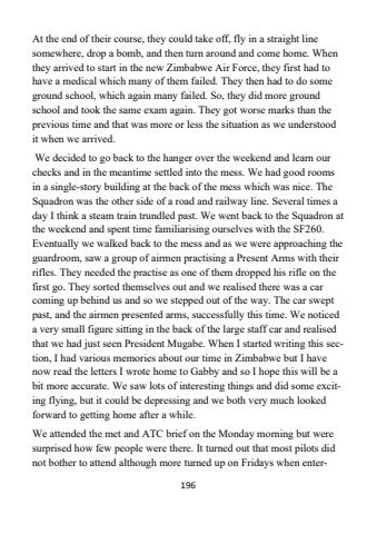 196At the end of their course, they could take off, fly in a straight line somewhere, drop a bomb, and then turn around and come home. When they arrived to start in the new Zimbabwe Air Force, they first had to have a medical which many of them failed. They then had to do some ground school, which again many failed. So, they did more ground school and took the same exam again. They got worse marks than the previous time and that was more or less the situation as we understood it when we arrived.We decided to go back to the hanger over the weekend and learn our checks and in the meantime settled into the mess. We had good rooms in a single-story building at the back of the mess which was nice. The Squadron was the other side of a road and railway line. Several times a day I think a steam train trundled past. We went back to the Squadron at the weekend and spent time familiarising ourselves with the SF260. Eventually we walked back to the mess and as we were approaching the guardroom, saw a group of airmen practising a Present Arms with their rifles. They needed the practise as one of them dropped his rifle on the first go. They sorted themselves out and we realised there was a carcoming up behind us and so we stepped out of the way. The car swept past, and the airmen presented arms, successfully this time. We noticed a very small figure sitting in the back of the large staff car and realised that we had just seen President Mugabe. When I started writing this section, I had various memories about our time in Zimbabwe but I have now read the letters I wrote home to Gabby and so I hope this will be a bit more accurate. We saw lots of interesting things and did some exciting flying, but it could be depressing and we both very much looked forward to getting home after a while.We attended the met and ATC brief on the Monday morning but were surprised how few people were there. It turned out that most pilots did not bother to attend although more turned up on Fridays when enter-