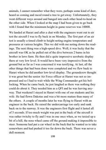 199animals, I cannot remember what they were, perhaps some kind of deer, heard us coming and raced round a tree to get away. Unfortunately, they went different ways around and banged into each other head-to-head on the other side. When I looked at the map I had been given to go back with I found that the minimum height in game reserves was 1000ft.We landed at Harari and after a chat with the engineers went out to air test the aircraft I was to fly back in on Monday. The first part of an air test is usually a timed climb to height noting engine temperature and pressures at various heights. This we did with me noting down the readings. The next thing was a high-speed dive. Well, it was lucky that the aircraft was OK as he pulled out of the dive between 2 barns in his brother in laws farm. He then did a quite impressive aerobatic display there at very low level. It would have been very impressive from the ground but as far as I was concerned it was terrifying. At last, all the other things that had been done were completed and we flew back to Harari where he did another low-level display. The groundcrew thought it was great but the senior Air Force officer at Harari was not so impressed and so I had to wait while the Wing Commander got his bollocking. When he came back, he just laughed as there was nothing they could do about it. They needed him as a QFI and he was leaving anyway. That weekend I stayed in Harari with one of our students and his wife. He had flown Dakotas and was a bit more mature than many of the others. A couple of months later he was flying to Harari with an engineer in the back. He raised the undercarriage too early and sank back on to the runway. It was the engineers first flight and it lasted all of 5 seconds. If too much weight was put in the back of the aircraft it was rather twitchy to fly and I was in one once when, as we taxied up a bit of a hill, the nose wheel came off the ground making it impossible to steer. Someone had put a car wheel in the back that he wanted us to take somewhere and had pushed it too far down the back. There was never a dull moment.