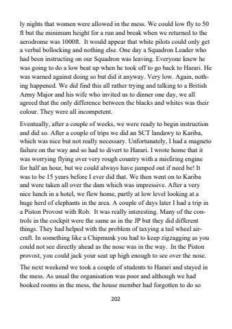 202ly nights that women were allowed in the mess. We could low fly to 50 ft but the minimum height for a run and break when we returned to the aerodrome was 1000ft. It would appear that white pilots could only get a verbal bollocking and nothing else. One day a Squadron Leader who had been instructing on our Squadron was leaving. Everyone knew he was going to do a low beat up when he took off to go back to Harari. He was warned against doing so but did it anyway. Very low. Again, nothing happened. We did find this all rather trying and talking to a British Army Major and his wife who invited us to dinner one day, we all agreed that the only difference between the blacks and whites was their colour. They were all incompetent.Eventually, after a couple of weeks, we were ready to begin instruction and did so. After a couple of trips we did an SCT landawy to Kariba, which was nice but not really necessary. Unfortunately, I had a magneto failure on the way and so had to divert to Harari. I wrote home that it was worrying flying over very rough country with a misfiring engine for half an hour, but we could always have jumped out if need be! It was to be 15 years before I ever did that. We then went on to Kariba and were taken all over the dam which was impressive. After a very nice lunch in a hotel, we flew home, partly at low level looking at a huge herd of elephants in the area. A couple of days later I had a trip in a Piston Provost with Rob. It was really interesting. Many of the controls in the cockpit were the same as in the JP but they did different things. They had helped with the problem of taxying a tail wheel aircraft. In something like a Chipmunk you had to keep zigzagging as you could not see directly ahead as the nose was in the way. In the Piston provost, you could jack your seat up high enough to see over the nose.The next weekend we took a couple of students to Harari and stayed in the mess. As usual the organisation was poor and although we had booked rooms in the mess, the house member had forgotten to do so