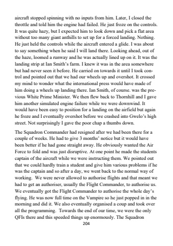 204aircraft stopped spinning with no inputs from him. Later, I closed the throttle and told him the engine had failed. He just froze on the controls. It was quite hazy, but I expected him to look down and pick a flat area without too many giant anthills to set up for a forced landing. Nothing. He just held the controls while the aircraft entered a glide. I was about to say something when he said I will land there. Looking ahead, out of the haze, loomed a runway and he was actually lined up on it. It was thelanding strip at Ian Smith%u2019s farm. I knew it was in the area somewhere but had never seen it before. He carried on towards it until I took control and pointed out that we had our wheels up and overshot. It crossed my mind to wonder what the international press would have made of him doing a wheels up landing there. Ian Smith, of course. was the previous White Prime Minister. We then flew back to Thornhill and I gave him another simulated engine failure while we were downwind. It would have been easy to position for a landing on the airfield but again he froze and I eventually overshot before we crashed into Gwelo%u2019s high street. Not surprisingly I gave the poor chap a thumbs down.The Squadron Commander had resigned after we had been there for a couple of weeks. He had to give 3 months%u2019 notice but it would have been better if he had gone straight away. He obviously wanted the Air Force to fold and was just disruptive. At one point he made the students captain of the aircraft while we were instructing them. We pointed out that we could hardly train a student and give him various problems if he was the captain and so after a day, we went back to the normal way of working. We were never allowed to authorise flights and that meant we had to get an authoriser, usually the Flight Commander, to authorise us. We eventually got the Flight Commander to authorise the whole day%u2019s flying. He was now full time on the Vampire so he just popped in in the morning and did it. We also eventually organised a coup and took over all the programming. Towards the end of our time, we were the only QFIs there and this speeded things up enormously. The Squadron