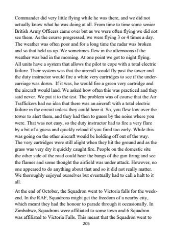 205Commander did very little flying while he was there, and we did not actually know what he was doing at all. From time to time some senior British Army Officers came over but as we were often flying we did not see them. As the course progressed, we were flying 3 or 4 times a day.The weather was often poor and for a long time the radar was broken and so that held us up. We sometimes flew in the afternoons if the weather was bad in the morning. At one point we got to night flying. All units have a system that allows the pilot to cope with a total electric failure. Their system was that the aircraft would fly past the tower and the duty instructor would fire a white very cartridges to see if the undercarriage was down. If it was, he would fire a green very cartridge and the aircraft would land. We asked how often this was practiced and they said never. We put it to the test. The problem was of course that the Air Traffickers had no idea that there was an aircraft with a total electric failure in the circuit unless they could hear it. So, you flew low over the tower to alert them, and they had then to guess by the noise where you were. That was not easy, so the duty instructor had to fire a very flare by a bit of a guess and quickly reload if you fired too early. While this was going on the other aircraft would be holding off out of the way. The very cartridges were still alight when they hit the ground and as the grass was very dry it quickly caught fire. People on the domestic site the other side of the road could hear the bangs of the gun firing and see the flames and some thought the airfield was under attack. However, no one appeared to do anything about that and so it did not really matter. We thoroughly enjoyed ourselves but eventually had to call a halt to it all.At the end of October, the Squadron went to Victoria falls for the weekend. In the RAF, Squadrons might get the freedom of a nearby city, which meant they had the honour to parade through it occasionally. In Zimbabwe, Squadrons were affiliated to some town and 6 Squadron was affiliated to Victoria Falls. This meant that the Squadron went to