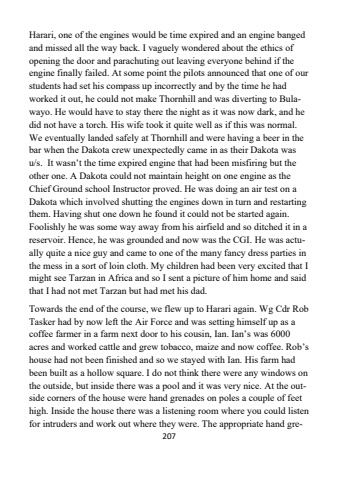 207Harari, one of the engines would be time expired and an engine banged and missed all the way back. I vaguely wondered about the ethics of opening the door and parachuting out leaving everyone behind if the engine finally failed. At some point the pilots announced that one of our students had set his compass up incorrectly and by the time he had worked it out, he could not make Thornhill and was diverting to Bulawayo. He would have to stay there the night as it was now dark, and he did not have a torch. His wife took it quite well as if this was normal. We eventually landed safely at Thornhill and were having a beer in the bar when the Dakota crew unexpectedly came in as their Dakota was u/s. It wasn%u2019t the time expired engine that had been misfiring but the other one. A Dakota could not maintain height on one engine as the Chief Ground school Instructor proved. He was doing an air test on a Dakota which involved shutting the engines down in turn and restarting them. Having shut one down he found it could not be started again. Foolishly he was some way away from his airfield and so ditched it in a reservoir. Hence, he was grounded and now was the CGI. He was actually quite a nice guy and came to one of the many fancy dress parties in the mess in a sort of loin cloth. My children had been very excited that I might see Tarzan in Africa and so I sent a picture of him home and said that I had not met Tarzan but had met his dad.Towards the end of the course, we flew up to Harari again. Wg Cdr Rob Tasker had by now left the Air Force and was setting himself up as a coffee farmer in a farm next door to his cousin, Ian. Ian%u2019s was 6000 acres and worked cattle and grew tobacco, maize and now coffee. Rob%u2019shouse had not been finished and so we stayed with Ian. His farm had been built as a hollow square. I do not think there were any windows on the outside, but inside there was a pool and it was very nice. At the outside corners of the house were hand grenades on poles a couple of feet high. Inside the house there was a listening room where you could listen for intruders and work out where they were. The appropriate hand gre-