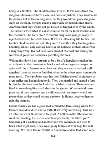 209being in a Weston. The children came with us. It was considered too dangerous to leave children alone in a house anywhere. They went to all the parties, but as the evening wore on, they would find places to go to sleep on the floor. Perhaps under a large table or behind some chairs. Anywhere that they would not get kicked or tripped over by the adults. The farmer%u2019s wife acted as a district nurse for all the farm workers and their families. She had a store of various drugs and syringes ready to inject anti-venom for snake bites. It was an interesting life for her. She had her children at home until they were 5 and then they had to go to a boarding school, only coming home in the holidays as their school was a long way away. Ian had been some kind of reservist and during the war would go out on horseback patrolling the area. Writing this down it all appears to be a bit of a hopeless situation but actually out in the countryside, blacks and whites appeared to get on quite well. Ian%u2019s foreman was black and they obviously worked well together. Later we were to find that wives in the urban areas were much more racist. Their problem was that they finished school at eighteen or even earlier and had nothing to do. They got married and started a family, but the children were looked after by black nannies. These nannies lived in something like small sheds in the garden. Wives would complain that if they were out and a child was sick, the nanny would not phone them as they could not use a phone. It did not occur to them to train the nannies.On the Sunday we had a good look around the farm seeing where the tobacco would be dried and so forth. It was very interesting. This was all interspersed with swims in the pool. And then in the afternoon we went out shooting. I missed a couple of pheasants, but Steve got 2. Someone got a warthog and another one was wounded. We tried to track it but it got dark, They were going to track it with dogs the next morning. We met a tracker whilst in Zimbabwe and he told some very
