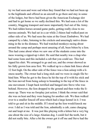 211try we had seen and were sad when they found that we had not been up to the highlands and offered us an aircraft to go there and stay in some of the lodges, but Steve had been given the American Exchange slot and had to get home so we sadly declined this. We had seen a lot of the country, blagging transport and more importantly fuel out of the Army. We had ridden horses around game parks, getting really close to numerous animals. We had sat in a car while 2 rhinos had walked past on either side of us. We had seen the ruins at the Great Zimbabwe. We had camped by a lake, listening to the crickets and amazingly native drumming in the in the distance. We had watched monkeys racing about around the camp and perhaps most amazing of all, been bitten by a lion. This had come about when we saw one of the students come into the mess wearing a ripped-up t-shirt. He said that nearby was a chap who had some lions and this included a cub that you could see. This had ripped his shirt. We arranged to go and see, and the owner showed us his fully grown lion area first. We walked up to a chain link fence about 12 foot high. On the other side of the fence was a lion asleep with a lioness nearby. The owner had a long stick and we were in single file behind him. When he got to the fence he hit the top of it with his stick and the lion moved from being asleep to bounding to the top of the fence in one movement. I leapt back terrified and banged into Steve who was behind. However, the lion dropped to the ground and then woke the lioness up. There was no foreplay just action. I think the owner said that she was on heat and they were hoping for another cub. We then walked over to a smaller fenced off area which had a large kennel in it. I was told to go and sit in the middle. If I stood up the lion would knock me over. I did as I was told and the lion, admittedly a cub, came charging out and leapt at me. It was just like playing with a kitten but a very big one about the size of a large Alsatian dog. I could feel the teeth, but it did not really bite. After a bit the owner got it off me and Steve had the