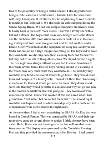 217lead to the possibility of being a maths teacher. I also upgraded from being a Cub Leader to a Scout leader. I had run Cubs for some time with Judy Thompson. It involved a fair bit of planning as well as weekly meetings but I enjoyed it. We also took the cubs camping during the School Spring Break. We had one camp at Brandsby but usually went to Hasty bank in the North York moors. That was a lovely site with a hut and a stream. The boys could make rope bridges across the stream and the hut had a little room where we leaders could sit in in the evening. Gabby and Tom came along to cook and we had another leader Elaine. Geoff Wood took all the equipment up using his Landrover and trailer and we put up a large marquis for eating in. The boys had to erect their own tents. We did supervise them cleaning teeth and themselves but they had to do lots of things themselves. We stayed out for 2 nights. The first night was always difficult as you had to chase them back to their beds several times. Excited boys running around in a clearing in the woods was very much what they wanted to do. The next day they would be very tired, and several wanted to go home. They would come to us and complain of a tummy ache. I would tell them that I had a magic medicine for that and would get some for them. They drank it and were told that they would be better in a minute and why not go and join in the football or whatever else was going on. They would and were immediately cured. Elaine was amazed at this and asked what I had given them. %u201cJust water, but do not tell them that.%u201d The second night would be much quieter and us adults would quietly sink a bottle or two of homemade wine as we chatted the night away.At the same time, I had to start organising the SSAFA Air Day that was hosted at Church Fenton. This was organised by SSAFA and their representative came up several times to confer. I think she may have been called Bella. If she was not I apologise to her but will use that name from now on. The display was sponsored by the Yorkshire Evening Post and they provided the commentator, Allen Rowley. I had control