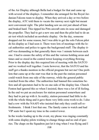 218of the Air Display although Bella had a budget for that and came up with several of the displays. I remember she arranged for the Royal Jordanian Falcons team to display. When they arrived a day or two before the display, ATC told them to vacate the runway next right but meant next convenient right. The pilot landing saw an exit just ahead of him and braked hard. This tipped his Pitts aircraft onto its nose and damaged the propeller. They had to get a new one and then the pilot had to do an air test which included an aerobatic display. On the day, someone dropped out for some reason, but I was able to get the solo Falcon pilot do his display as I had seen it. There were lots of meetings with the local authorities and police to agree the background stuff. The display itself was demanding in that generally there was 1 minute between each one. I had to ensure the safety of this and the various holding areas and times and so stood in the control tower keeping everything flowing.Prior to the display day this required lots of meeting with the SATCO and we worked well together. I note however, that the SATCO and his staff got a thanks mention in the official program but not me! One problem that came up at the start was that in the past the station personnel could watch from one side of the runway, while the general public watched from the other. The authorities had banned this sometime before and all spectators had to be on one side of the display line. Church Fenton had ignored this so when I insisted, there was a lot of ill feeling. In the end we put an enclosure for station personnel somewhere and they had to put up with it. In reality, station personnel had little to do with the whole thing and it gave them very little extra work to do. I also had a row with the NAAFI who insisted that only they could sell refreshments. I think I lost that one. The family came to watch and had VIP seats but I spent my time in the control tower. In the weeks leading up to the event, my phone was ringing constantly with some display pilots wishing to change things and no end of queries. The chaps on the Squadron just let it ring when I was flying and I