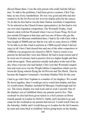 219did not blame them. I was the only person who really had the full picture. To add to the problems, I had been given a creamie, Chris Topham, as one of my standardisers. He was very good and able and also wanted to be the Jet Provost low level air display pilot for the season. To do this he first had to win the Inter Station Aerobatic Competition. To be selected as the Church Fenton representative, he first had to win our own inter Squadron competition, The Wormald Trophy. I had shared a desk with Ian Wormald when I was on Exam Wing. He lived just outside Elvington at that time and was one of those who got the Yorkshire Air Museum established there. I had to fly with Chris with a base height of 5000ft and see that he was safe to come down to 1500ft. To be able to do this I had to perform at 1500ft myself which I did not enjoy at all. Once I had cleared him and one of the other competitors at 1500ft he was progressively cleared to 500 ft. I had to watch every practise he did and they were also filmed. He had to keep current and if he went out of currency had to practice first at a higher height and then work down again. These practises usually took place at the end of the day when everyone else had landed. Chris won that Wormald competition and went on to win the Wright Jubilee Competition which was between the flying schools flying the Jet Provost and The Hawk. Thus he became the Support Command%u2019s Aerobatic Display Pilot for the yearI had to go with Chris Topham to a number of Air displays. We would fly down together, then I would get out to watch him display and then we would return. Displays included St Mawgan, Farnborough and Jersey. The Jersey display was mid week and we took 2 aircraft. One of the displays was at Guildford where my parents used to live. That weekend we also had been given tickets to a Sol Lumiere on Horse Guards parade in London by SSAFA. Gabby and I decided to go and camp for the weekend as my parents had moved. I could watch Chris on the Saturday, Gabby and I would then go to London for the Sol Lumiere by train and come back to Guldford before going home on the Sunday.