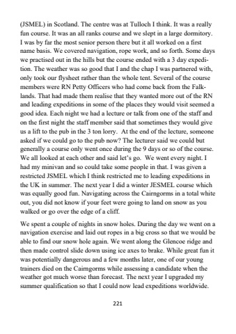 221(JSMEL) in Scotland. The centre was at Tulloch I think. It was a really fun course. It was an all ranks course and we slept in a large dormitory. I was by far the most senior person there but it all worked on a first name basis. We covered navigation, rope work, and so forth. Some days we practised out in the hills but the course ended with a 3 day expedition. The weather was so good that I and the chap I was partnered with, only took our flysheet rather than the whole tent. Several of the course members were RN Petty Officers who had come back from the Falklands. That had made them realise that they wanted more out of the RN and leading expeditions in some of the places they would visit seemed a good idea. Each night we had a lecture or talk from one of the staff and on the first night the staff member said that sometimes they would give us a lift to the pub in the 3 ton lorry. At the end of the lecture, someone asked if we could go to the pub now? The lecturer said we could but generally a course only went once during the 9 days or so of the course. We all looked at each other and said let%u2019s go. We went every night. I had my minivan and so could take some people in that. I was given a restricted JSMEL which I think restricted me to leading expeditions in the UK in summer. The next year I did a winter JESMEL course which was equally good fun. Navigating across the Cairngorms in a total white out, you did not know if your feet were going to land on snow as you walked or go over the edge of a cliff. We spent a couple of nights in snow holes. During the day we went on a navigation exercise and laid out ropes in a big cross so that we would be able to find our snow hole again. We went along the Glencoe ridge and then made control slide down using ice axes to brake. While great fun it was potentially dangerous and a few months later, one of our young trainers died on the Cairngorms while assessing a candidate when the weather got much worse than forecast. The next year I upgraded my summer qualification so that I could now lead expeditions worldwide.