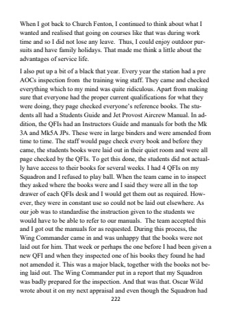222When I got back to Church Fenton, I continued to think about what I wanted and realised that going on courses like that was during work time and so I did not lose any leave. Thus, I could enjoy outdoor pursuits and have family holidays. That made me think a little about the advantages of service life. I also put up a bit of a black that year. Every year the station had a preAOCs inspection from the training wing staff. They came and checked everything which to my mind was quite ridiculous. Apart from making sure that everyone had the proper current qualifications for what they were doing, they page checked everyone%u2019s reference books. The students all had a Students Guide and Jet Provost Aircrew Manual. In addition, the QFIs had an Instructors Guide and manuals for both the Mk 3A and Mk5A JPs. These were in large binders and were amended from time to time. The staff would page check every book and before they came, the students books were laid out in their quiet room and were all page checked by the QFIs. To get this done, the students did not actually have access to their books for several weeks. I had 4 QFIs on my Squadron and I refused to play ball. When the team came in to inspect they asked where the books were and I said they were all in the top drawer of each QFIs desk and I would get them out as required. However, they were in constant use so could not be laid out elsewhere. As our job was to standardise the instruction given to the students we would have to be able to refer to our manuals. The team accepted this and I got out the manuals for as requested. During this process, the Wing Commander came in and was unhappy that the books were not laid out for him. That week or perhaps the one before I had been given a new QFI and when they inspected one of his books they found he had not amended it. This was a major black, together with the books not being laid out. The Wing Commander put in a report that my Squadron was badly prepared for the inspection. And that was that. Oscar Wild wrote about it on my next appraisal and even though the Squadron had