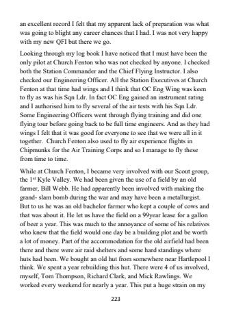 223an excellent record I felt that my apparent lack of preparation was what was going to blight any career chances that I had. I was not very happy with my new QFI but there we go.Looking through my log book I have noticed that I must have been the only pilot at Church Fenton who was not checked by anyone. I checked both the Station Commander and the Chief Flying Instructor. I also checked our Engineering Officer. All the Station Executives at Church Fenton at that time had wings and I think that OC Eng Wing was keen to fly as was his Sqn Ldr. In fact OC Eng gained an instrument rating and I authorised him to fly several of the air tests with his Sqn Ldr. Some Engineering Officers went through flying training and did one flying tour before going back to be full time engineers. And as they had wings I felt that it was good for everyone to see that we were all in it together. Church Fenton also used to fly air experience flights in Chipmunks for the Air Training Corps and so I manage to fly these from time to time. While at Church Fenton, I became very involved with our Scout group, the 1st Kyle Valley. We had been given the use of a field by an old farmer, Bill Webb. He had apparently been involved with making the grand- slam bomb during the war and may have been a metallurgist. But to us he was an old bachelor farmer who kept a couple of cows and that was about it. He let us have the field on a 99year lease for a gallon of beer a year. This was much to the annoyance of some of his relatives who knew that the field would one day be a building plot and be worth a lot of money. Part of the accommodation for the old airfield had been there and there were air raid shelters and some hard standings where huts had been. We bought an old hut from somewhere near Hartlepool I think. We spent a year rebuilding this hut. There were 4 of us involved, myself, Tom Thompson, Richard Clark, and Mick Rawlings. We worked every weekend for nearly a year. This put a huge strain on my