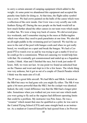 19to carry a certain amount of camping equipment which added to the weight. At some point we abandoned this equipment and accepted the penalty time faults for doing so. At that time, the flight safety symbol was a crow. We had crows painted on the hulls of the canoe which were a reflection of the crew inside. Our Crow was a very scruffy one with feathers flying off. During the race people on the bank would tell us how much further ahead the other canoes in our team were which made it rather fun. We were a long way back of course. We did several practice weekends, and I remember staying in the mess at Hullavingdon which was where they used to pack parachutes at one time. We also did an all-night paddle in the swimming pool at Cranwell. We tied the canoes to the end of the pool with bungee cords and when we got really bored, we would put on a spurt and break the bungee. We had a Corporal PTI to watch over us and he was trying to get a maths O level so he could go for a commission. When not canoeing we would help him with that. He eventually got commissioned and ended up as a Squadron Leader, I think. Alan and I finished the race, but it took just under 43 hours. Still, we were not last. At one point we found an unlocked boat on the Thames and went and slept in it for a few hours. The whole thing was very arduous, but it got us out of a couple of Church Parades which I think was the main aim of it all.The JP was a great little aircraft. We had Mk3s and Mk4s. I started on the Mk4 but once we had gone solo you might fly either. The Mk 4 was quite a bit more powerful than the Mk3, but the cockpit was identical. Indeed, the only visual difference was that the Mk4 had a longer pitot tube. Sometimes when you walked out you were not sure which mark you were going to fly and as the engines had different operating limits that could be a problem. My instructor was Pete Jones. He was a %u201ccreamie%u201d which meant that once he qualified as a pilot, he was sent to the Central Flying School (CFS) and came straight back as an instructor. As a student at Cranwell himself he had ejected from a Jet Provost