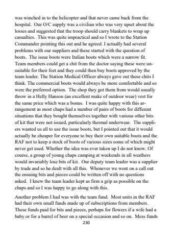 230was winched in to the helicopter and that never came back from the hospital. Our O/C supply was a civilian who was very upset about the losses and suggested that the troop should carry blankets to wrap up casualties. This was quite impractical and so I wrote to the Station Commander pointing this out and he agreed. I actually had several problems with our suppliers and these started with the question of boots. The issue boots were Italian boots which were a narrow fit. Team members could get a chit from the doctor saying these were unsuitable for their feet and they could then buy boots approved by the team leader. The Station Medical Officer always gave out these chits I think. The commercial boots would always be more comfortable and so were the preferred option. The shop they got them from would usually throw in a Helly Hanson (an excellent make of outdoor wear) vest for the same price which was a bonus. I was quite happy with this arrangement as most chaps had a number of pairs of boots for different situations that they bought themselves together with various other bits of kit that were not issued, particularly thermal underwear. The suppliers wanted us all to use the issue boots, but I pointed out that it would actually be cheaper for everyone to buy their own suitable boots and the RAF not to keep a stock of boots of various sizes some of which might never get used. Whether the idea was ever taken up I do not know. Of course, a group of young chaps camping at weekends in all weathers would invariably lose bits of kit. Our deputy team leader was a supplier by trade and so he dealt with all this. Whenever we went on a call out the ensuing bits and pieces could be written off with no questions asked. I knew the team leader kept as firm a grip as possible on the chaps and so I was happy to go along with this. Another problem I had was with the team fund. Most units in the RAF had their own small funds made up of subscriptions from members. These funds paid for bits and pieces, perhaps for flowers if a wife had a baby or for a barrel of beer on a special occasion and so on. Mess funds