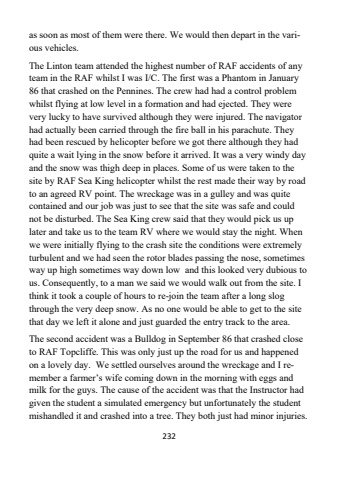 232as soon as most of them were there. We would then depart in the various vehicles.The Linton team attended the highest number of RAF accidents of any team in the RAF whilst I was I/C. The first was a Phantom in January 86 that crashed on the Pennines. The crew had had a control problem whilst flying at low level in a formation and had ejected. They were very lucky to have survived although they were injured. The navigator had actually been carried through the fire ball in his parachute. They had been rescued by helicopter before we got there although they had quite a wait lying in the snow before it arrived. It was a very windy day and the snow was thigh deep in places. Some of us were taken to the site by RAF Sea King helicopter whilst the rest made their way by road to an agreed RV point. The wreckage was in a gulley and was quite contained and our job was just to see that the site was safe and could not be disturbed. The Sea King crew said that they would pick us up later and take us to the team RV where we would stay the night. When we were initially flying to the crash site the conditions were extremely turbulent and we had seen the rotor blades passing the nose, sometimes way up high sometimes way down low and this looked very dubious to us. Consequently, to a man we said we would walk out from the site. I think it took a couple of hours to re-join the team after a long slog through the very deep snow. As no one would be able to get to the site that day we left it alone and just guarded the entry track to the area. The second accident was a Bulldog in September 86 that crashed close to RAF Topcliffe. This was only just up the road for us and happened on a lovely day. We settled ourselves around the wreckage and I remember a farmer%u2019s wife coming down in the morning with eggs and milk for the guys. The cause of the accident was that the Instructor had given the student a simulated emergency but unfortunately the student mishandled it and crashed into a tree. They both just had minor injuries.