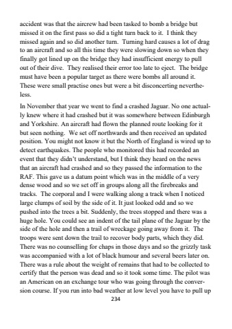 234accident was that the aircrew had been tasked to bomb a bridge but missed it on the first pass so did a tight turn back to it. I think they missed again and so did another turn. Turning hard causes a lot of drag to an aircraft and so all this time they were slowing down so when they finally got lined up on the bridge they had insufficient energy to pull out of their dive. They realised their error too late to eject. The bridge must have been a popular target as there were bombs all around it. These were small practise ones but were a bit disconcerting nevertheless. In November that year we went to find a crashed Jaguar. No one actually knew where it had crashed but it was somewhere between Edinburgh and Yorkshire. An aircraft had flown the planned route looking for it but seen nothing. We set off northwards and then received an updated position. You might not know it but the North of England is wired up to detect earthquakes. The people who monitored this had recorded an event that they didn%u2019t understand, but I think they heard on the news that an aircraft had crashed and so they passed the information to the RAF. This gave us a datum point which was in the middle of a very dense wood and so we set off in groups along all the firebreaks and tracks. The corporal and I were walking along a track when I noticed large clumps of soil by the side of it. It just looked odd and so we pushed into the trees a bit. Suddenly, the trees stopped and there was a huge hole. You could see an indent of the tail plane of the Jaguar by the side of the hole and then a trail of wreckage going away from it. The troops were sent down the trail to recover body parts, which they did. There was no counselling for chaps in those days and so the grizzly task was accompanied with a lot of black humour and several beers later on. There was a rule about the weight of remains that had to be collected to certify that the person was dead and so it took some time. The pilot was an American on an exchange tour who was going through the conversion course. If you run into bad weather at low level you have to pull up