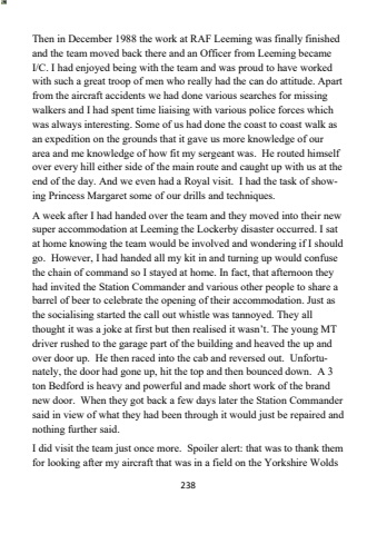 238Then in December 1988 the work at RAF Leeming was finally finished and the team moved back there and an Officer from Leeming became I/C. I had enjoyed being with the team and was proud to have worked with such a great troop of men who really had the can do attitude. Apart from the aircraft accidents we had done various searches for missing walkers and I had spent time liaising with various police forces which was always interesting. Some of us had done the coast to coast walk as an expedition on the grounds that it gave us more knowledge of ourarea and me knowledge of how fit my sergeant was. He routed himself over every hill either side of the main route and caught up with us at the end of the day. And we even had a Royal visit. I had the task of showing Princess Margaret some of our drills and techniques.A week after I had handed over the team and they moved into their new super accommodation at Leeming the Lockerby disaster occurred. I sat at home knowing the team would be involved and wondering if I should go. However, I had handed all my kit in and turning up would confuse the chain of command so I stayed at home. In fact, that afternoon they had invited the Station Commander and various other people to share a barrel of beer to celebrate the opening of their accommodation. Just as the socialising started the call out whistle was tannoyed. They all thought it was a joke at first but then realised it wasn%u2019t. The young MTdriver rushed to the garage part of the building and heaved the up and over door up. He then raced into the cab and reversed out. Unfortunately, the door had gone up, hit the top and then bounced down. A 3 ton Bedford is heavy and powerful and made short work of the brand new door. When they got back a few days later the Station Commander said in view of what they had been through it would just be repaired and nothing further said. I did visit the team just once more. Spoiler alert: that was to thank them for looking after my aircraft that was in a field on the Yorkshire Wolds
