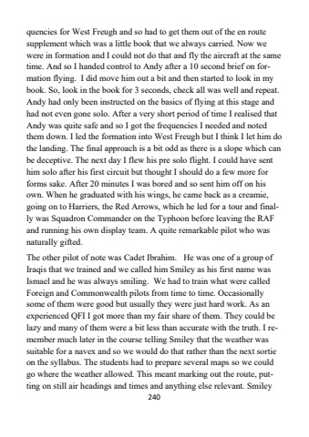 240quencies for West Freugh and so had to get them out of the en route supplement which was a little book that we always carried. Now we were in formation and I could not do that and fly the aircraft at the same time. And so I handed control to Andy after a 10 second brief on formation flying. I did move him out a bit and then started to look in my book. So, look in the book for 3 seconds, check all was well and repeat. Andy had only been instructed on the basics of flying at this stage and had not even gone solo. After a very short period of time I realised that Andy was quite safe and so I got the frequencies I needed and noted them down. I led the formation into West Freugh but I think I let him do the landing. The final approach is a bit odd as there is a slope which can be deceptive. The next day I flew his pre solo flight. I could have sent him solo after his first circuit but thought I should do a few more for forms sake. After 20 minutes I was bored and so sent him off on his own. When he graduated with his wings, he came back as a creamie, going on to Harriers, the Red Arrows, which he led for a tour and finally was Squadron Commander on the Typhoon before leaving the RAF and running his own display team. A quite remarkable pilot who was naturally gifted.The other pilot of note was Cadet Ibrahim. He was one of a group of Iraqis that we trained and we called him Smiley as his first name was Ismael and he was always smiling. We had to train what were called Foreign and Commonwealth pilots from time to time. Occasionally some of them were good but usually they were just hard work. As an experienced QFI I got more than my fair share of them. They could be lazy and many of them were a bit less than accurate with the truth. I remember much later in the course telling Smiley that the weather was suitable for a navex and so we would do that rather than the next sortie on the syllabus. The students had to prepare several maps so we could go where the weather allowed. This meant marking out the route, putting on still air headings and times and anything else relevant. Smiley