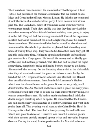 244The Canadians came to unveil the memorial at Tholthorpe on 7 June 1986. I had persuaded the Station Commander that we would hold a Meet and Greet in the officers Mess at Linton. He left this up to me and it took the form of a sort of cocktail party. I have no idea how it was paid for. The Canadians, many of whom had come with their wiveswere a great bunch. Their view on life was that they had survived the war when so many of their friends had not and they were going to enjoy it to the full. They all had fascinating tales to tell. One of the organisers recalled how as he taxied out for a raid; a light swept over his aircraft from somewhere. This convinced him that he would be shot down and was scared for the whole trip. Another explained that when they went home it was by troop ship. They were to be demobbed once they got off and this took some time. He had to spend another night on board and got involved in a Craps game. He lost all his money and so finally got off the ship and met his girlfriend, who also had had to spend the night somewhere, completely broke and had to borrow money to get home. She married him anyway. On the Saturday after a visit to the old airfield sites they all marched around the green as did our scouts, led by the band of the RAF Regiment from Catterick. Air Marshal Don Bennet then unveiled the monument. I met him in Mr Lancaster%u2019s kitchen which was the closest house to the green. It was not very tidy, and I doubt whether the Air Marshal had been in such a place for many years. He told me to tell him what to do and we went out for the unveiling. He was an extraordinary man. He had so much charisma that I think the ducks stopped quacking when he spoke. He remarked that the Canadians had had the heaviest casualties in Bomber Command and went on to praise them all. That evening we all went to the Cairn Hydro Hotel in Harrogate for a ball. The hotel had a lovely sprung floored ballroom which was great to dance on. However, our French-Canadian guests with their accents quickly snapped up our wives and proved to be great dancers. During the meal, I sat opposite to the Air Marshal who was