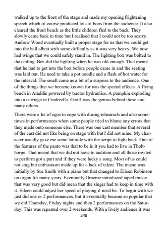 248walked up to the front of the stage and made my opening frightening speech which of course produced lots of boos from the audience. It also cleared the front bench as the little children fled to the back. They slowly came back in time but I realised that I could not be too scarry. Andrew Wood eventually built a proper stage for us that we could get into the hall albeit with some difficulty as it was very heavy. We now had wings that we could safely stand in. The lighting box was bolted to the ceiling. Ben did the lighting when he was old enough. That meant that he had to get into the box before people came in and the seating was laid out. He used to take a pot noodle and a flask of hot water for the interval. The smell came as a bit of a surprise to the audience. One of the things that we became known for was the special effects. A flyingbench in Aladdin powered by tractor hydraulics. A pumpkin exploding into a carriage in Cinderella. Geoff was the genius behind these and many others.There were a lot of egos to cope with during rehearsals and also sometimes in performances when some people tried to blame any errors that they made onto someone else. There was one cast member that several of the cast did not like being on stage with but I did not mine. My character usually gave me some latitude with the script to fight back. One of the features of the panto was that to be in it you had to live in Tholthorpe. That meant that we did not have to audition and all those invited to perform got a part and if they were lucky a song. Most of us could not sing but enthusiasm made up for a lack of talent. The music was initially by Sue Smith with a piano but that changed to Eileen Robinson on organ for many years. Eventually Graeme introduced taped music that was very good but did mean that the singer had to keep in time with it. Eileen could adjust her speed of playing if need be. To begin with we just did one or 2 performances, but it eventually became so popular that we did Thursday, Friday nights and then 2 performances on the Saturday. This was repeated over 2 weekends. With a lively audience it was