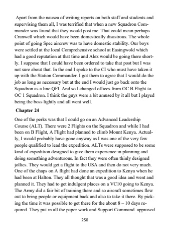 250Apart from the nausea of writing reports on both staff and students and supervising them all, I was terrified that when a new Squadron Commander was found that they would post me. That could mean perhaps Cranwell which would have been domestically disastrous. The whole point of going Spec aircrew was to have domestic stability. Our boys were settled at the local Comprehensive school at Easingwold which had a good reputation at that time and Alex would be going there shortly. I suppose that I could have been ordered to take that post but I was not sure about that. In the end I spoke to the CI who must have taken it up with the Station Commander. I got them to agree that I would do the job as long as necessary but at the end I would just go back onto the Squadron as a line QFI. And so I changed offices from OC B Flight to OC 1 Squadron. I think the guys were a bit amused by it all but I played being the boss lightly and all went well.Chapter 24One of the perks was that I could go on an Advanced Leadership Course (ALT). There were 2 Flights on the Squadron and while I had been on B Flight, A Flight had planned to climb Mount Kenya. Actually, I would probably have gone anyway as I was one of the very few people qualified to lead the expedition. ALTs were supposed to be some kind of expedition designed to give them experience in planning and doing something adventurous. In fact they were often thinly designed jollies. They would get a flight to the USA and then do not very much. One of the chaps on A flight had done an expedition to Kenya when he had been at Halton. They all thought that was a good idea and went and planned it. They had to get indulgent places on a VC10 going to Kenya. The Army did a fair bit of training there and so aircraft sometimes flew out to bring people or equipment back and also to take it there. By picking the time it was possible to get there for the about 8 %u2013 10 days required. They put in all the paper work and Support Command approved