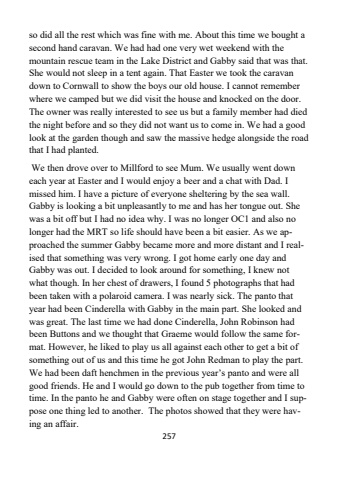 257so did all the rest which was fine with me. About this time we bought a second hand caravan. We had had one very wet weekend with the mountain rescue team in the Lake District and Gabby said that was that. She would not sleep in a tent again. That Easter we took the caravan down to Cornwall to show the boys our old house. I cannot remember where we camped but we did visit the house and knocked on the door. The owner was really interested to see us but a family member had died the night before and so they did not want us to come in. We had a good look at the garden though and saw the massive hedge alongside the road that I had planted.We then drove over to Millford to see Mum. We usually went down each year at Easter and I would enjoy a beer and a chat with Dad. I missed him. I have a picture of everyone sheltering by the sea wall. Gabby is looking a bit unpleasantly to me and has her tongue out. She was a bit off but I had no idea why. I was no longer OC1 and also no longer had the MRT so life should have been a bit easier. As we approached the summer Gabby became more and more distant and I realised that something was very wrong. I got home early one day and Gabby was out. I decided to look around for something, I knew not what though. In her chest of drawers, I found 5 photographs that had been taken with a polaroid camera. I was nearly sick. The panto that year had been Cinderella with Gabby in the main part. She looked and was great. The last time we had done Cinderella, John Robinson had been Buttons and we thought that Graeme would follow the same format. However, he liked to play us all against each other to get a bit of something out of us and this time he got John Redman to play the part. We had been daft henchmen in the previous year%u2019s panto and were all good friends. He and I would go down to the pub together from time to time. In the panto he and Gabby were often on stage together and I suppose one thing led to another. The photos showed that they were having an affair.
