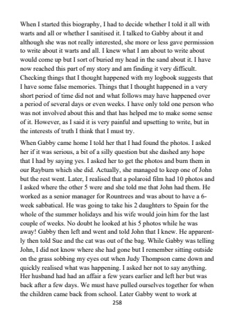 258When I started this biography, I had to decide whether I told it all with warts and all or whether I sanitised it. I talked to Gabby about it and although she was not really interested, she more or less gave permission to write about it warts and all. I knew what I am about to write about would come up but I sort of buried my head in the sand about it. I have now reached this part of my story and am finding it very difficult. Checking things that I thought happened with my logbook suggests that I have some false memories. Things that I thought happened in a very short period of time did not and what follows may have happened over a period of several days or even weeks. I have only told one person who was not involved about this and that has helped me to make some sense of it. However, as I said it is very painful and upsetting to write, but in the interests of truth I think that I must try. When Gabby came home I told her that I had found the photos. I asked her if it was serious, a bit of a silly question but she dashed any hope that I had by saying yes. I asked her to get the photos and burn them in our Rayburn which she did. Actually, she managed to keep one of John but the rest went. Later, I realised that a polaroid film had 10 photos and I asked where the other 5 were and she told me that John had them. He worked as a senior manager for Rountrees and was about to have a 6-week sabbatical. He was going to take his 2 daughters to Spain for the whole of the summer holidays and his wife would join him for the last couple of weeks. No doubt he looked at his 5 photos while he was away! Gabby then left and went and told John that I knew. He apparently then told Sue and the cat was out of the bag. While Gabby was telling John, I did not know where she had gone but I remember sitting outside on the grass sobbing my eyes out when Judy Thompson came down and quickly realised what was happening. I asked her not to say anything. Her husband had had an affair a few years earlier and left her but was back after a few days. We must have pulled ourselves together for when the children came back from school. Later Gabby went to work at