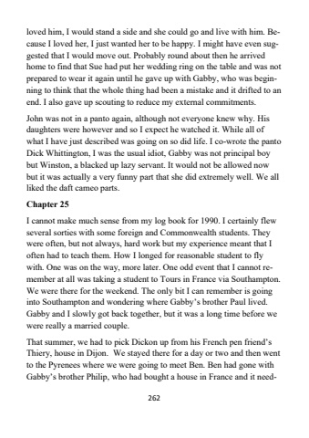 262loved him, I would stand a side and she could go and live with him. Because I loved her, I just wanted her to be happy. I might have even suggested that I would move out. Probably round about then he arrived home to find that Sue had put her wedding ring on the table and was not prepared to wear it again until he gave up with Gabby, who was beginning to think that the whole thing had been a mistake and it drifted to an end. I also gave up scouting to reduce my external commitments.John was not in a panto again, although not everyone knew why. His daughters were however and so I expect he watched it. While all ofwhat I have just described was going on so did life. I co-wrote the panto Dick Whittington, I was the usual idiot, Gabby was not principal boy but Winston, a blacked up lazy servant. It would not be allowed now but it was actually a very funny part that she did extremely well. We all liked the daft cameo parts. Chapter 25I cannot make much sense from my log book for 1990. I certainly flew several sorties with some foreign and Commonwealth students. They were often, but not always, hard work but my experience meant that I often had to teach them. How I longed for reasonable student to fly with. One was on the way, more later. One odd event that I cannot remember at all was taking a student to Tours in France via Southampton. We were there for the weekend. The only bit I can remember is going into Southampton and wondering where Gabby%u2019s brother Paul lived.Gabby and I slowly got back together, but it was a long time before we were really a married couple. That summer, we had to pick Dickon up from his French pen friend%u2019s Thiery, house in Dijon. We stayed there for a day or two and then went to the Pyrenees where we were going to meet Ben. Ben had gone with Gabby%u2019s brother Philip, who had bought a house in France and it need-