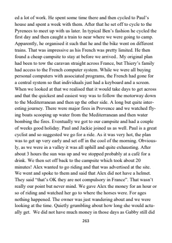 263ed a lot of work. He spent some time there and then cycled to Paul%u2019s house and spent a week with them. After that he set off to cycle to the Pyrenees to meet up with us later. In typical Ben%u2019s fashion he cycled the first day and then caught a train to near where we were going to camp. Apparently, he organised it such that he and the bike went on different trains. That was impressive as his French was pretty limited. He then found a cheap campsite to stay at before we arrived.. My original plan had been to tow the caravan straight across France, but Thiery%u2019s family had access to the French computer system. While we were all buying personal computers with associated programs, the French had gone for a central system so that individuals just had a keyboard and a screen. When we looked at that we realised that it would take days to get across and that the quickest and easiest way was to follow the motorway down to the Mediterranean and then up the other side. A long but quite interesting journey. There were major fires in Provence and we watched flying boats scooping up water from the Mediterranean and then water bombing the fires. Eventually we got to our campsite and had a coupleof weeks good holiday. Paul and Jackie joined us as well. Paul is a great cyclist and so suggested we go for a ride. As it was very hot, the plan was to get up very early and set off in the cool of the morning. Obviously, as we were in a valley it was all uphill and quite exhausting. After about 3 hours the sun was up and we stopped probably at a caf%u00e9 for a drink. We then set off back to the campsite which took about 20 minutes! Alex wanted to go riding and that was advertised at the site. We went and spoke to them and said that Alex did not have a helmet. They said %u201cthat%u2019s OK they are not compulsory in France%u201d. That wasn%u2019t really our point but never mind. We gave Alex the money for an hour or so of riding and watched her go to where the horses were. For ages nothing happened. The owner was just wandering about and we were looking at the time. Quietly grumbling about how long she would actually get. We did not have much money in those days as Gabby still did