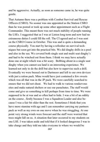 267and be aggressive. Actually, as soon as someone came in, he was quite gentle.That Autumn there was a problem with Combat Survival and Rescue Officers (CSRO). No sooner was one appointed as the Station CSRO than he was posted or took up some other appointment such as a Flight Commander. This meant there was not much stability of people running the LSEs. I suggested that as I was at Linton long term and now had no extraneous duties I could fill the roll. The CI agreed and so I was sent on the CSRO Course in October. This was and is quite a demanding course physically. You start by having a refresher on survival techniques but soon get into the practical bits. We did dinghy drills in a pool and also in the sea. We covered both single seat and multi seat dinghy%u2019sand had to be winched out from them. I think we may have actually done one at night which was a bit scary. Bobbing about in a single seat dinghy when you cannot sea land is an interesting experience. We learned not only to do the drill but also how to supervise such a drill. Eventually we were bussed out to Dartmoor and left to our own devices with just a ration pack. Mine would have just contained a few sweets which was all that was in the JP pack. We were carefully searched to ensure that we did not cheat. We had to walk to various rendezvous sites and make natural shelters or use our parachutes. The staff would come and give us something to kill perhaps from time to time. We were supposed to be at war and so often had to hide. I was a bit of an oddity on the course , firstly because I was a Squadron Leader and also because I was a fair bit older than the rest. Sometimes I think that you have more stamina with age and I can remember carrying my partners pack as well as my own on one move when he was struggling. At one point very strong winds were forecast and the staff were worried that trees might fall on us. A situation that later occurred to my students on one LSE. I was taken aside and told that if it looked dangerous I was to take charge and they told me take everyone to where we would be