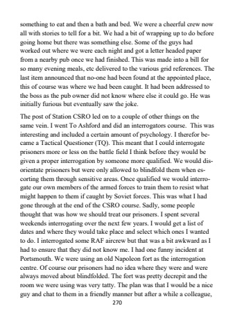 270something to eat and then a bath and bed. We were a cheerful crew now all with stories to tell for a bit. We had a bit of wrapping up to do before going home but there was something else. Some of the guys had worked out where we were each night and got a letter headed paper from a nearby pub once we had finished. This was made into a bill for so many evening meals, etc delivered to the various grid references. The last item announced that no-one had been found at the appointed place, this of course was where we had been caught. It had been addressed to the boss as the pub owner did not know where else it could go. He was initially furious but eventually saw the joke. The post of Station CSRO led on to a couple of other things on the same vein. I went To Ashford and did an interrogators course. This was interesting and included a certain amount of psychology. I therefor became a Tactical Questioner (TQ). This meant that I could interrogate prisoners more or less on the battle field I think before they would be given a proper interrogation by someone more qualified. We would disorientate prisoners but were only allowed to blindfold them when escorting them through sensitive areas. Once qualified we would interrogate our own members of the armed forces to train them to resist what might happen to them if caught by Soviet forces. This was what I had gone through at the end of the CSRO course. Sadly, some people thought that was how we should treat our prisoners. I spent several weekends interrogating over the next few years. I would get a list of dates and where they would take place and select which ones I wanted to do. I interrogated some RAF aircrew but that was a bit awkward as I had to ensure that they did not know me. I had one funny incident at Portsmouth. We were using an old Napoleon fort as the interrogation centre. Of course our prisoners had no idea where they were and were always moved about blindfolded. The fort was pretty decrepit and the room we were using was very tatty. The plan was that I would be a nice guy and chat to them in a friendly manner but after a while a colleague,