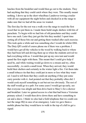 275lunches from the breakfast and would then go out to the students. They had anything that they could catch where they were. This usually meant nothing. I drove up in the short wheelbase Landrover towing a trailer with all our equipment the night before and checked in at the range to make sure that we had all the areas we wanted.The first day for the rest was a walk over the range to reach the first wood that we put them in. I made them build single shelters with bits of parachute. To begin with we had lots of old parachutes and they could have one each. Later they just got the bits they needed. I spent time sorting all of those bits out and getting them washed after each exercise. This took quite a while and was something else I would do whilst DSS. The Duty QFI could of course phone me if there was a problem. I would have got all the vehicles to the wood by walking back to where they had been left and driving them up so when the students arrived we had everything with us. I would then put up my own tent and would spend the first night with them. This meant that I could give help if need be, and while waiting would go down to a stream and try, often successfully , to catch a small trout. When they arrived, they would build their shelters and certainly in the winter light a fire. I let them take a small tobacco tin that they could put in more or less what they wanted. I used to tell them that they could eat anything if they put some curry powder with it. And pointed out that they probably often did. I would cook myself something to eat but not too obviously. The rest of the staff would go to a pub. For some years I would get up early, see that everyone was alright and then drive back to Mary%u2019s for a shower and breakfast. Later we gained access to a hut that had been a Victorian primary school. I would then drive down there and have something to eat and a shave. I think we also had a field telephone that we could contact the range HQ in case of an emergency. Later we gave them a mobile phone but they would have to walk to the top of a hill to get a signal.