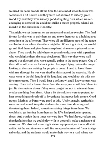 279we used the same woods all the time the amount of wood to burn was sometimes a bit limited and they were not allowed to cut any green wood. By now they were usually good at lighting fires which was encouraging as some of the could not strike a match properly when I demoed it in the classroom. Honestly! That night we set them out on an escape and evasion exercise. The final format for this was to pair them up and move them out to a holding area sometime in the afternoon. They were all on different parts of the range and had no idea where the others might be. When it got dark, we would go and find them and give them a map hand drawn on a piece of parachute. They would be told where to go and rendezvous with a partisan who would give them the next checkpoint. This way they were well spaced out although they were actually going to the same places. One of the staff would man each check point. I enjoyed lying out on the range looking at the stars waiting for people to come. I used to have Harry with me although he was very tired by this stage of the exercise. He always went to the full length of his long lead and would not sit with me for some reason. Then I would hear a soft growl and I knew a team was coming. If we had a hunter force from the army, we would brief them tojust lie the students down if they were caught but not to mistreat them or take anything from them. After a bit the soldiers were to pretend to hear something and rush off to investigate letting our lads escape. Good troops, Marines or Paras were good at this. Unfortunately, territorials were not and would keep the students for some time shouting and threatening them. Indeed, sometimes taking things from them. We would also go hunting from them as the RVs had particular opening times. And outside those times we were free. We had flares, rockets and thunderflashes that we could play with to generally make a nuisance of ourselves. We also had some night vision equipment, so it was all a bit unfair. At the end time we would fire an agreed number of flares to signal endex and the students would make their way to a road where we